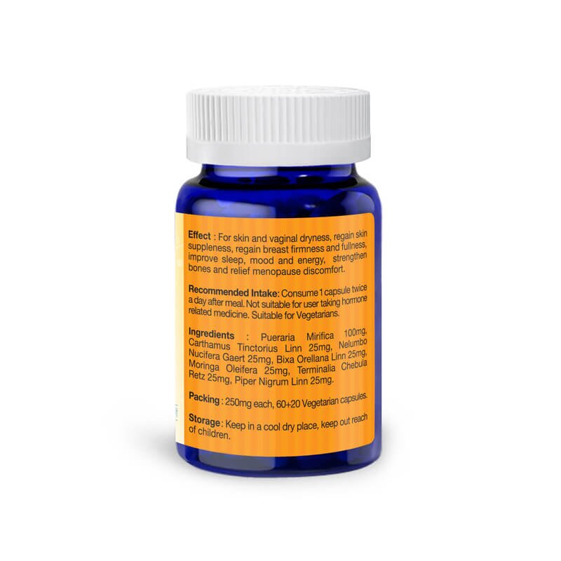 成分:Pueraria Mirifica 100mg, Carthamus Tinctorius Linn 25mg, Nelumbo Nucifera Gaert 25mg, Bixa Orellana Linn 25g, Moringa Oleifera 25mg, Terminalia Chebula Retz 25mg, Piper Nigrum Linn 25mg
